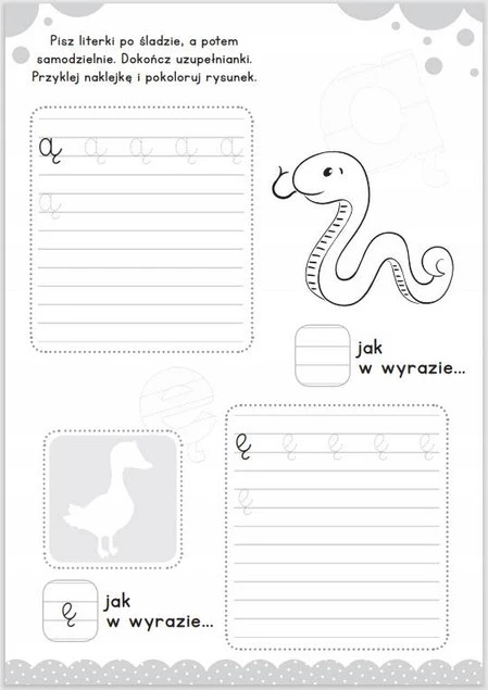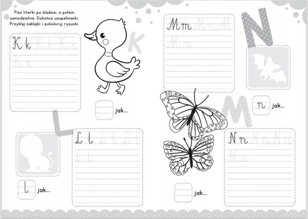 Pisz literki po śladzie, zgodnie ze wskazówkami, a potem samodzielnie. Spójrz na rysunki i dokończ uzupełnianki: b jak bóbr, f jak foka, j jak jeż... Koloruj, odszukuj i naklejaj!