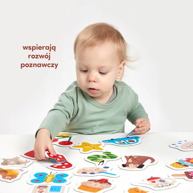 Ćwiczcie spostrzegawczość, wyszukując pasujące połówki, i sprawność rączek, łącząc je ze sobą. Pomóż maluchowi, jeśli tego potrzebuje. Możecie zacząć zabawę od mniejszej liczby układanek.