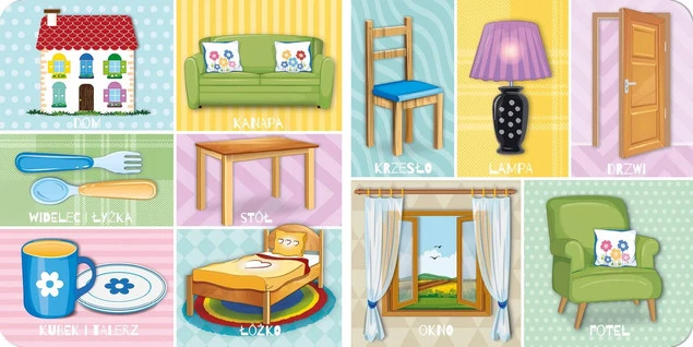 Przeznaczona dla dzieci w wieku 0+, zawiera najważniejsze słowa z kategorii: dom, rodzina, zabawa, warzywa, owoce, kolory, zwierzęta, ubrania, części ciała i czynności.
