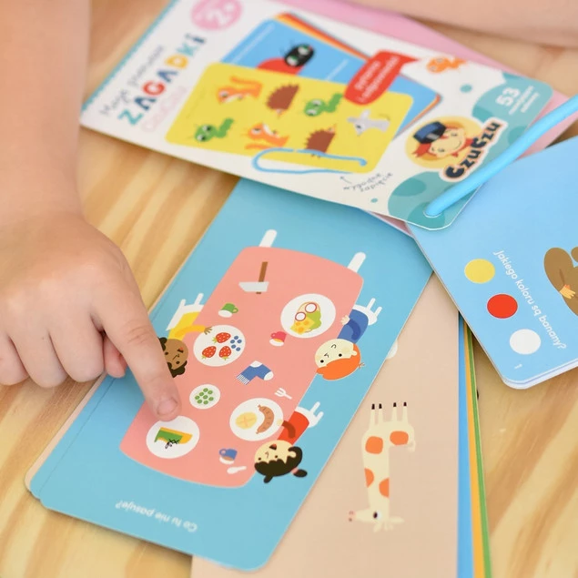 Gdy poznacie już odpowiedzi na wszystkie pytania, zadawaj zagadki dotyczące innych elementów ilustracji. Książeczki z edukacyjnej serii doskonale sprawdzają się w domu, w poczekalni czy na spacerze. To doskonały pomysł na zabawkę do auta na podróż.