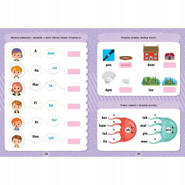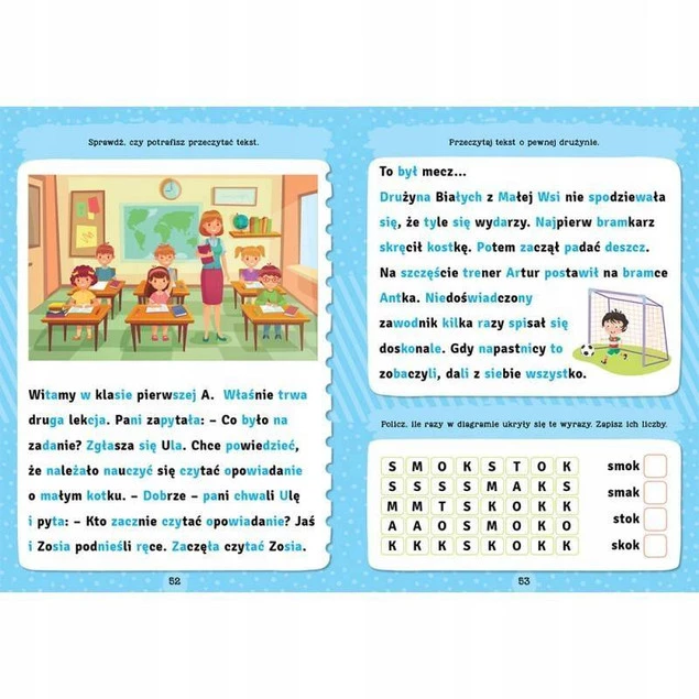 - Różnorodne zadania – od łamigłówek z grupami wyrazów po krótkie czytanki – przyciągną i zainteresują małych czytelników.