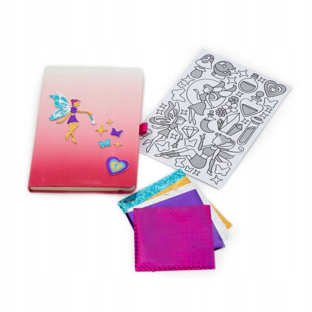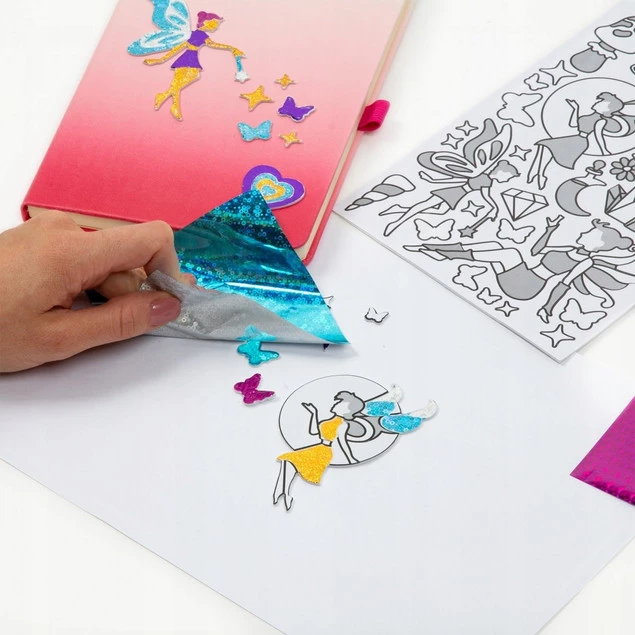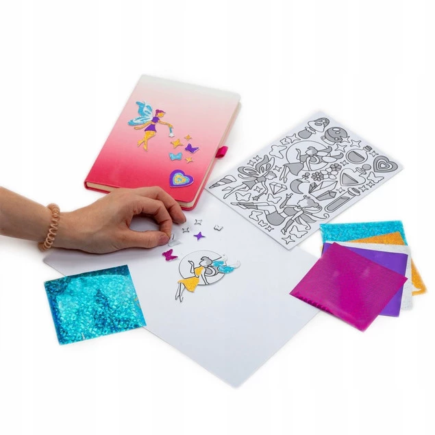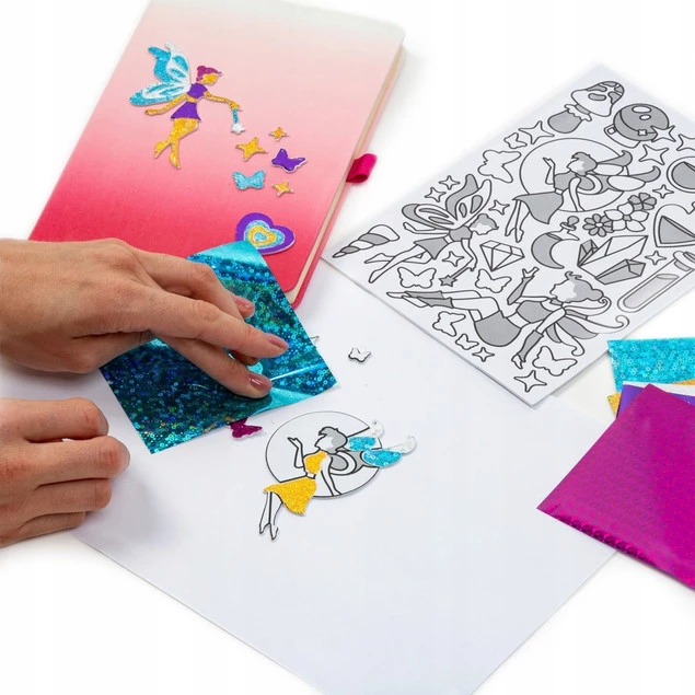 W zestawie znajduje się arkusz z naklejkami z magicznymi postaciami i kształtami oraz 5 kolorowych folii: fioletowa, różowa, niebieska, złota i srebrna.