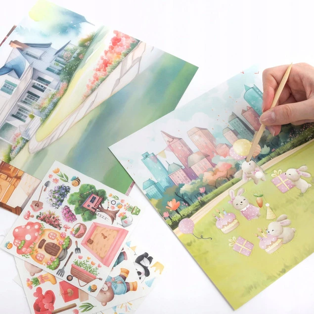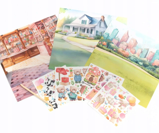 Zestaw kreatywny kalkomania. W tym kreatywnym zestawie znajdują się trzy arkusze z tłem do ozdobienia, 83 elementy do przekalkowania oraz drewniany rysik. Kalkomania to niezwykle twórcza i prosta zabawa dla każdego! Wystarczy przyłożyć wybraną folię z kalkomanią do arkusza z tłem i potrzeć obrazek drewnianym rysikiem. Odbite na papierze obrazki pozwalają na stworzenie własnej, magicznej historii w świecie misiów rozwijając przy tym wyobraźnię dziecka.