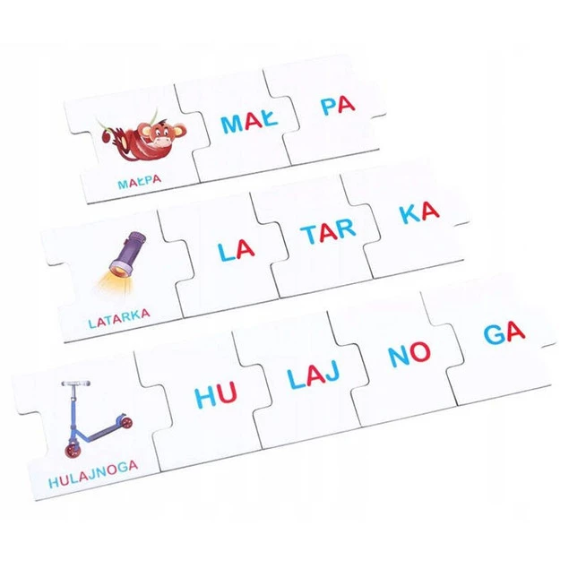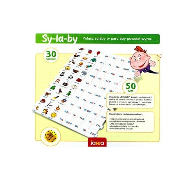Układanka "SYLABY" kształci umiejętności ważne w nauce czytania i pisania. Do obrazka należy dopasować odpowiednie sylaby, aby powstała nazwa przedmiotu. Podczas zabawy dzieci rozwijają analizę i syntezę wzrokową i słuchową. Pomocna w nauczaniu początkowym.