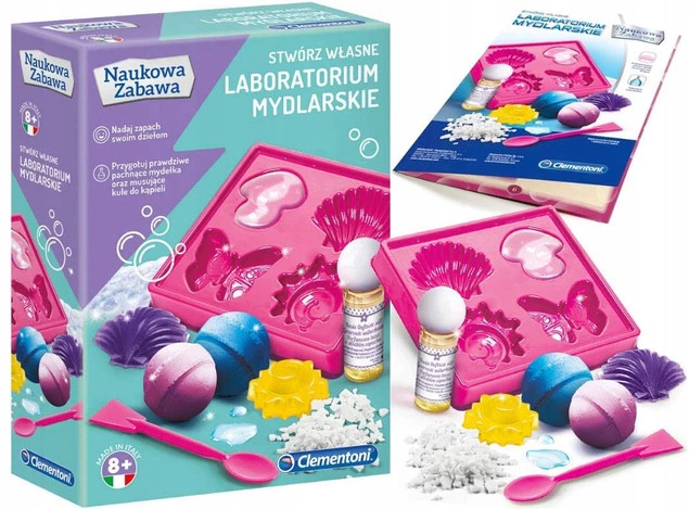 Laboratorium Mydlarskie od Clementoni to fascynujący zestaw edukacyjny, który pozwala dzieciom poznać sztukę wytwarzania mydełek oraz musujących kul do kąpieli. Ten kreatywny i pachnący zestaw zawiera wszystko, czego potrzebujesz, by tworzyć własne, aromatyczne kosmetyki, uczyć się o naturalnych składnikach i eksperymentować z bańkami mydlanymi.