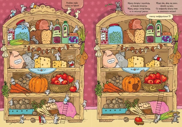 Poznaj rodzinę Wąsików – Freda i Melę oraz ich liczne potomstwo. Odwiedź z nimi pracownię plastyczną, spiżarnię, mysią szkołę, a także wesołe myszeczko! Weź udział w wyścigu, spędź miło czas na koncercie i odpocznij przy ognisku. Może nawet uda ci się wyruszyć na wyprawę w kosmos i posprzątać jezioro? Przy okazji sprawdzisz swoją spostrzegawczość, wyszukując ukryte szczegóły i rozwiązując zagadki.