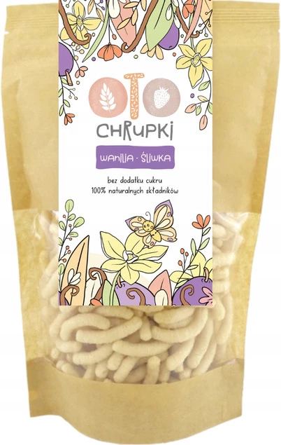 Chrupki Wanilia-Śliwka - Zanurzcie się w wyjątkowym smaku naszych chrupek, gdzie delikatna wanilia spotyka się z soczystą śliwką i nutką liofilizowanego jabłka tworząc magiczną symfonię smaków. Bazą tej chrupiącej przekąski są pełnoziarnista orkiszowa i odrobina ryżu.