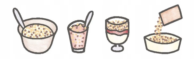 OTO Kulki jako płatki jaglano-gryczane bez cukru świetnie komponują się z mlekiem, jogurtem, serkiem, napojem roślinnym, owocowym musem, a także stanowią zdrową przekąskę lub dodatek do ulubionych deserów.