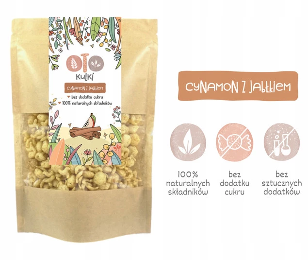 Kulki CYNAMON Z JABŁKIEM — Zapraszamy Cię do podróży do magicznej Otolandii, gdzie nasze płatki śniadaniowe stają się prawdziwym rarytasem w Twojej codziennej diecie. Nasze płatki, w kształcie uroczych gwiazdek i kulek, przeniosą Cię do bajkowego świata smaku i zdrowia.