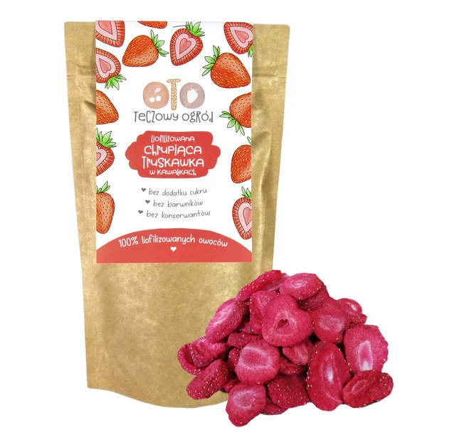 Owoce liofilizowane z OtoLandii można zabrać ze sobą do pracy, do szkoły, na wycieczkę czy spacer z dziećmi na drugie śniadanie lub przekąskę. Zapakowane są w ekologiczne, szczelnie zamykane opakowanie ze struną wielokrotnego użytku. Oferowane truskawki liofilizowane charakteryzuje przystępna cena, dlatego nie wahaj się – spróbuj tego pysznego przysmaku, a gwarantujemy, że wrócisz do nas po kolejne opakowania, a liofilizowana truskawka stanie się Twoją ulubioną przekąską.