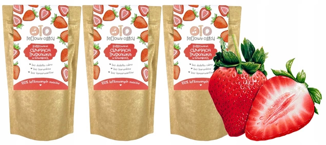 Owoce liofilizowane z OtoLandii można zabrać ze sobą do pracy, do szkoły, na wycieczkę czy spacer z dziećmi na drugie śniadanie lub przekąskę. Zapakowane są w ekologiczne, szczelnie zamykane opakowanie ze struną wielokrotnego użytku. Oferowane truskawki liofilizowane charakteryzuje przystępna cena, dlatego nie wahaj się – spróbuj tego pysznego przysmaku, a gwarantujemy, że wrócisz do nas po kolejne opakowania, a liofilizowana truskawka stanie się Twoją ulubioną przekąską.