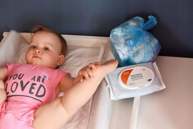 - kolor błękitny, skrywa zawartość zużytych pieluszek i chusteczek
