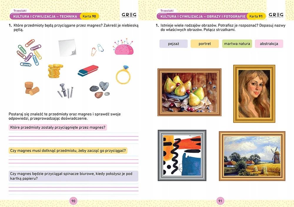![]() | Trzeciaki. Karty Pracy w Szkole i w Domu GregTrzeciaki przeznaczone są dla uczniów klasy 3 szkoły podstawowej. Jest to pozycja odpowiadająca zakresem tematycznym zagadnieniom z programu nauczania zintegrowanego, zawiera zadania dotyczące podstaw języka polskiego, nauk społecznych, ekologii, historii, biologii i geografii. Pojawiają się tematy poruszane na lekcjach w klasie 3, takie jak uczucia i emocje, zdrowie i higiena, zdrowe odżywianie się, ciało człowieka, rolnictwo i rośliny uprawne, podstawy wiadomości o ekosystemach, zwierzęta świata, obieg wody w przyrodzie, surowce naturalne, wiadomości o kosmosie, technika, transport i podróże, czas i kalendarz, podstawy wiadomości o geografii i historii Polski, podstawy wiadomości o krajach świata, znani i sławni Polacy oraz wiele innych zagadnień. Ćwiczenia językowe doskonalą umiejętności nabyte w poprzednich klasach oraz wprowadzają kolejne formy pisemne, jak plan czy opis. Zadania są atrakcyjne i ciekawe, rozwijają zarówno zasób wiedzy, jak kreatywność, wyobraźnię i logiczne myślenie. Jednocześnie szata graficzna jest bardzo kolorowa, przyjemna dla oka ucznia. Jedna kartka codziennie wystarczy, by zapewnić opanowanie przez dziecko programu klasy 3! Polecamy dla każdego trzecioklasisty!