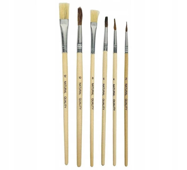 Uniwersalny zestaw 6 pędzelków w rozmiarach: 2, 4, 6, 8, 10, 12 (2 płaskie i 4 okrągłe).