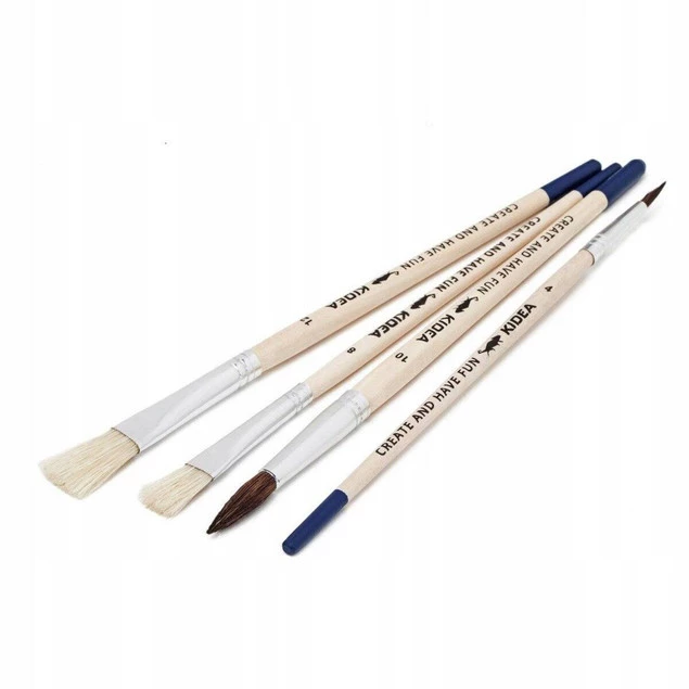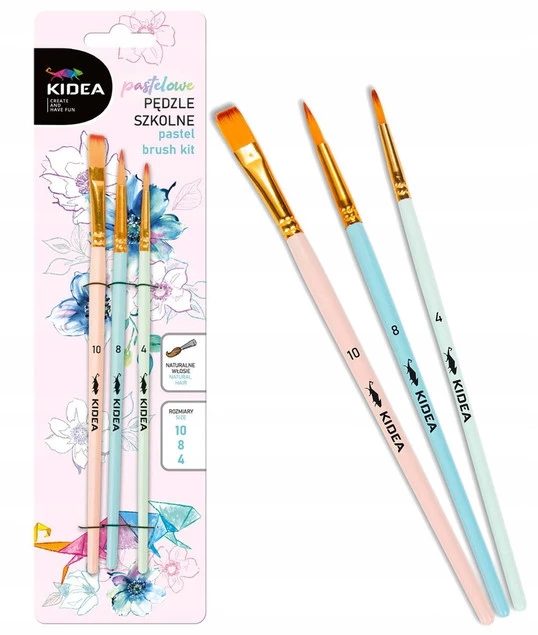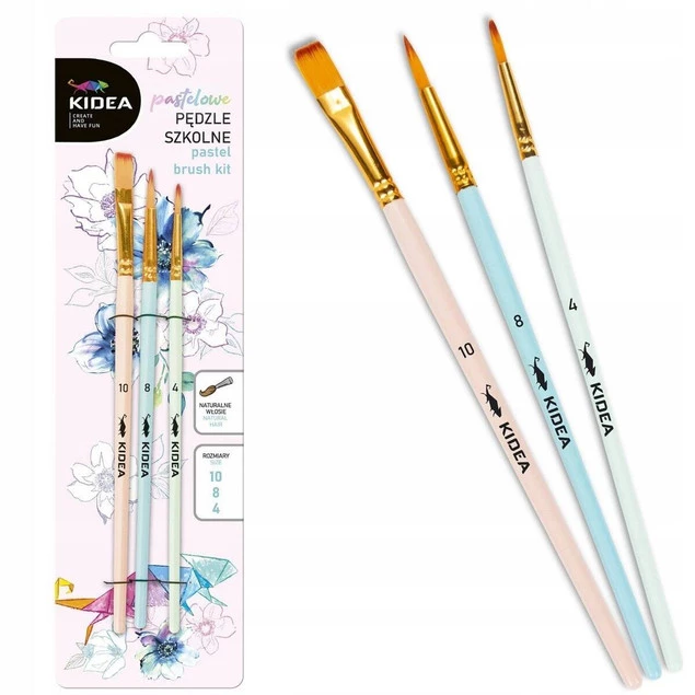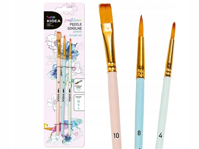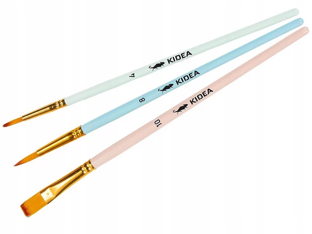 Pędzle do malowania Kidea z końcówką z naturalnym włosiem w 3 rozmiarach: 10, 8 i 4. Końcówki o różnych wielkościach i kształtach idealnie sprawdzą się podczas malowania detali, tła, czy mieszania kolorów na płótnie.