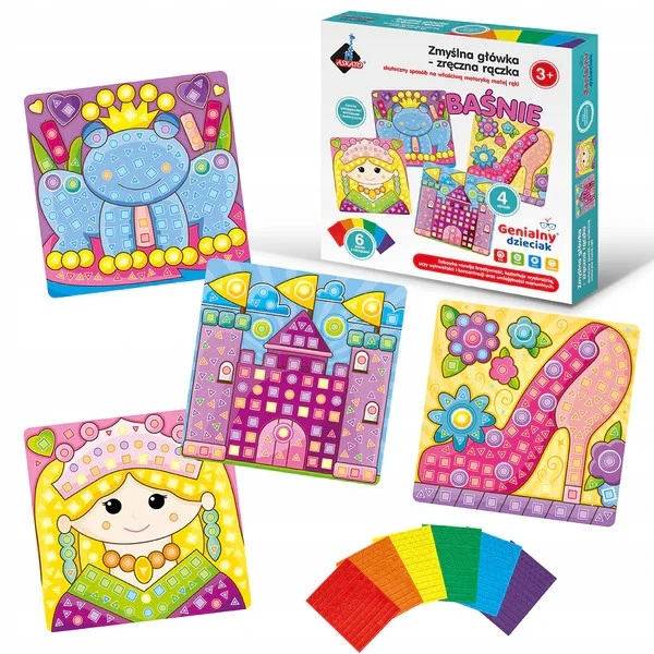 W zestawie znajdują się 4 obrazki – księżniczka, żabka, pałac i pantofelek, a także 6 arkuszy z kolorowymi naklejkami w kształcie kółka, trójkąta i kwadratu. Zadaniem dziecka jest dopasowanie kształtów w odpowiednie miejsca, aby stworzyć swoje piękne dzieło.