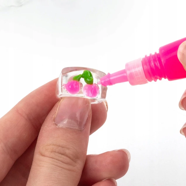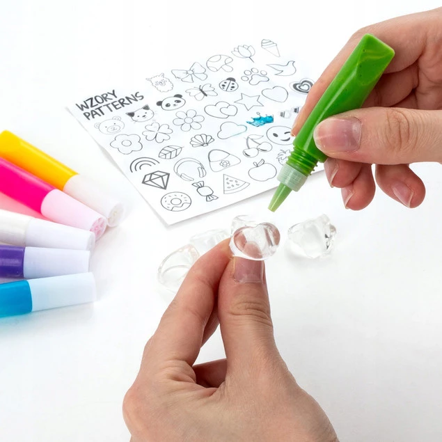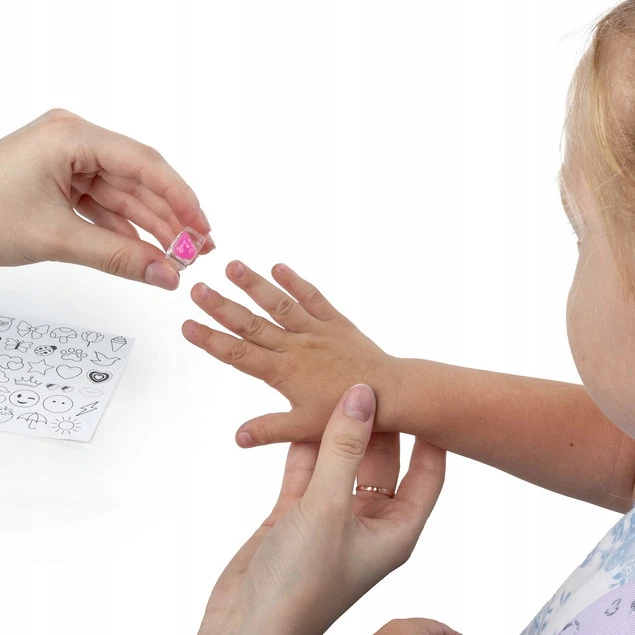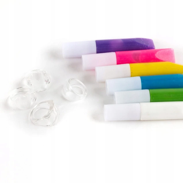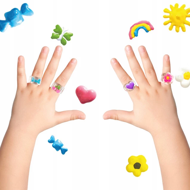 Dla miłośników mody i ozdób na własnych zasadach. Piękne pierścionki, które możesz stworzyć samodzielnie. Wybierz szablon, połóż na nim folię i odrysuj ulubiony wzór, nakładając około 2 mm żelu 3D. Po 24 godzinach delikatnie odklej wzór z folii i przenieś na pierścionek. Gdy poczujesz chęć zmiany – po prostu zdejmij stary wzór i stwórz zupełnie nowy! Kreatywna zabawa, która nigdy się nie nudzi. W zestawie znajdziesz szablon z gotowymi wzorami. 4 pierścionki oraz 6 kolorów żelu 3D fioletowy, różowy, niebieski, biały, żółty oraz zielony.