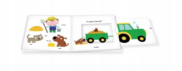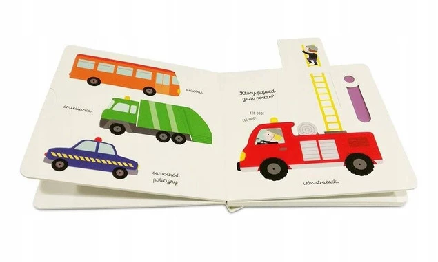 Dzięki książce z ruchomymi elementami „Pojazdy” dziecko nauczy się nazw pojazdów, które może zobaczyć na ulicy, torach, na morzu lub w powietrzu. Pozna odpowiedzi na pytania m.in. o to który pojazd podnosi ciężary i który gasi pożary.