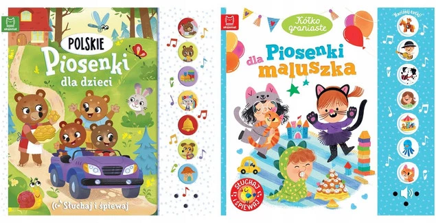 Wspaniały zestaw dwóch książek z polskimi piosenkami dla dzieci: "Polskie Piosenki Dla Dzieci Słuchaj i Śpiewaj" oraz "Kółko Graniaste Piosenki Dla Maluszka" autorstwa Anny Podgórskiej. Obie książki są idealne dla dzieci w wieku 0+ i wydane przez wydawnictwo Aksjomat. To świetna okazja, aby wprowadzić maluchy w świat muzyki i cieszyć się wspólnym czasem pełnym radości i zabawy!