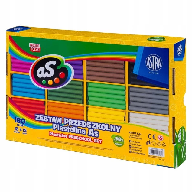Zestaw plasteliny Astra zawiera 180 lasek plasteliny w 12 intensywnych, żywych kolorach, po 15 sztuk każdego koloru. Produkt jest idealny do zabawy, nauki modelowania oraz ćwiczeń terapeutycznych w domu, przedszkolu i szkole. Plastelina jest miękka, elastyczna i nie klei się do rąk, co ułatwia modelowanie nawet najmłodszym dzieciom.