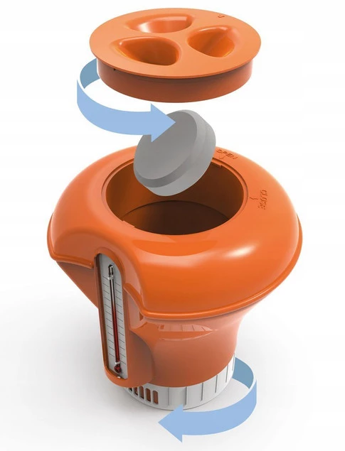 Pływa do chemii basenowej z termometrem Do dawkowania preparatów chemii basenowej w postaci tabletek o śr. 7,6 cm Materiał wykonania: tworzywo sztuczne