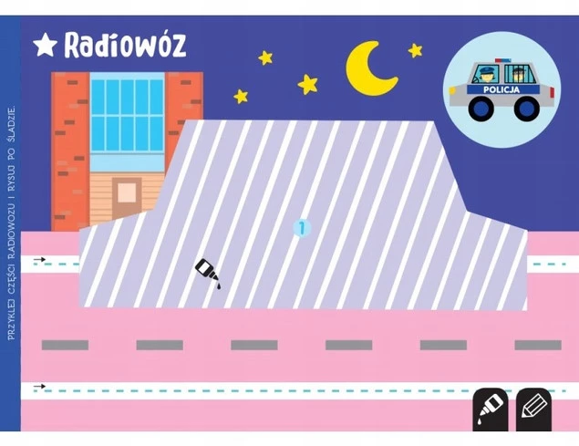 Jak z niej korzystać? Dziecko wycina proste elementy i przykleja w odpowiedniej kolejności tak, by powstał obrazek, a całość kompozycji dopełnia, rysując po linii przerywanej. Perforacja w książce ułatwia wyrywanie kart i wycinanie.