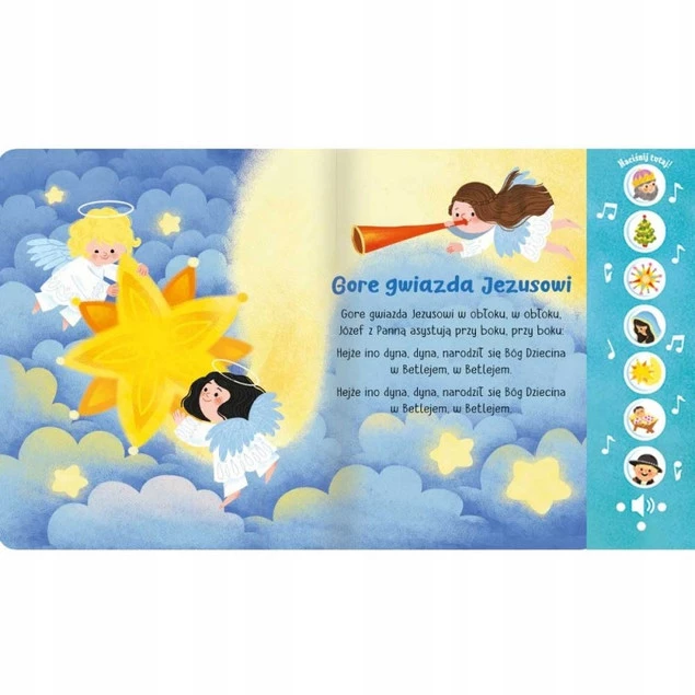 Jak korzystać z książki? Należy nacisnąć kółeczko z obrazkiem, by włączyć piosenkę. Chcesz wyłączyć? Naciśnij kółeczko jeszcze raz. Nagrania kolęd nie są ani za ciche, ani za głośne – w sam raz dla małego dziecka. W książce znajdują się teksty wszystkich zamieszczonych na nagraniach kolęd, a ładne i staranne ilustracje są dodatkowym walorem tego tytułu. Twarda oprawa i kartonowe karty sprawiają, że książka jest trwała i bezpieczna, a format odpowiedni dla małego dziecka. Książka do oglądania, słuchania i śpiewania! Doskonała do rodzinnego świątecznego muzykowania oraz kultywowania tradycji.