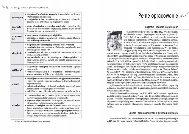Wydanie Proszę państwa do gazu i Ludzi, którzy szli kompletne bez skrótów i cięć w treści. W tym wydaniu znajdziesz odpowiedzi na pytania z podręcznika - „pewniak na teście”, czyli wskazanie zagadnień, które zwykle pojawiają się w pytaniach z danej lektury we wszelkich testach sprawdzających wiedzę, a także w podręcznikach i na klasówkach. Książka zawiera pełen tekst lektury. Na końcu książki zamieszczono opracowanie, w którym znajduje się bardzo szczegółowe streszczenie oraz drugie skrócone, ułatwiające szybkie przygotowanie się przed lekcją. Opracowanie zawiera ponadto plan wydarzeń, wnikliwie wyjaśnioną problematykę oraz szerokie charakterystyki bohaterów.