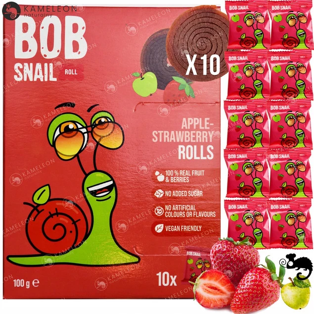 Cześć, tu Bob – Ślimak który produkuje zdrowe przekąski! Chciałbym, żeby wszyscy jedli tylko to, co jest naprawdę pyszne, a przy tym byli zdrowi i szczęśliwi. Właśnie dlatego robię owocowe smakołyki bez dodatku cukru, konserwantów i barwników, żeby każdy mógł cieszyć się ich pysznym smakiem do woli!