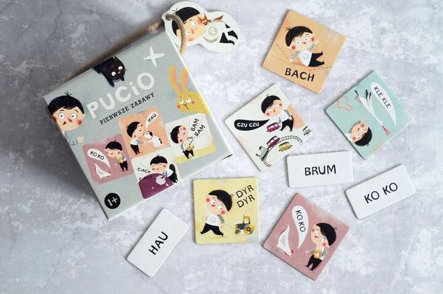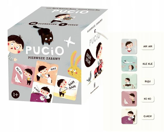 Zestaw składa się z dwóch rodzajów kartoników. Na jednych znajdują się obrazki z wyrażeniem dźwiękonaśladowczym, a także obiektem lub zwierzęciem wydającym dany dźwięk oraz wizerunkiem Pucia – ulubionego bohatera maluchów. Na drugich są wyłącznie teksty – te same onomatopeje, które występują na kartonikach z obrazkami.