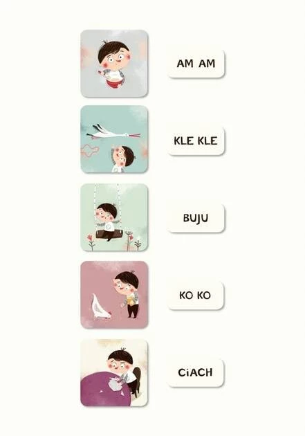 Wyrażenia dźwiękonaśladowcze są wypowiadane już przez roczne dzieci i stanowią bardzo istotny element rozwoju mowy. Zebrane w estetycznym pudełku obrazki dają okazję do rozmaitych zabaw, w zależności od możliwości intelektualnych i potrzeb dziecka: nauki nazywania obiektów, powtarzania i rozpoznawania wyrażeń dźwiękonaśladowczych, wyszukiwania wskazanych przez rodziców obiektów spośród kilku wybranych kartoników i wielu innych gier (opisanych w dołączonej do zestawu instrukcji). Zabawka może także stanowić pomoc w stawianiu pierwszych kroków w nauce czytania.