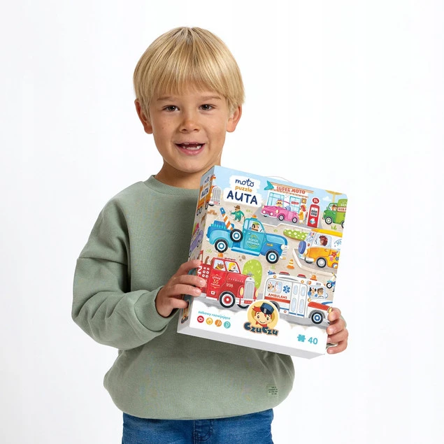 Duża edukacyjna układanka składa się z 40 elementów i przedstawia ulubione pojazdy dzieciaków: różnego rodzaju auta, śmieciarkę, wóz strażacki, karetkę czy pomoc drogową. Układanie puzzli to wszechstronnie rozwijająca zabawa: pozwala doskonalić małą motorykę, spostrzegawczość i cierpliwość. Dodatkowo jest świetnym wstępem do rozmów, poszerzania wiedzy i podstawą dalszych kreatywnych zabaw.