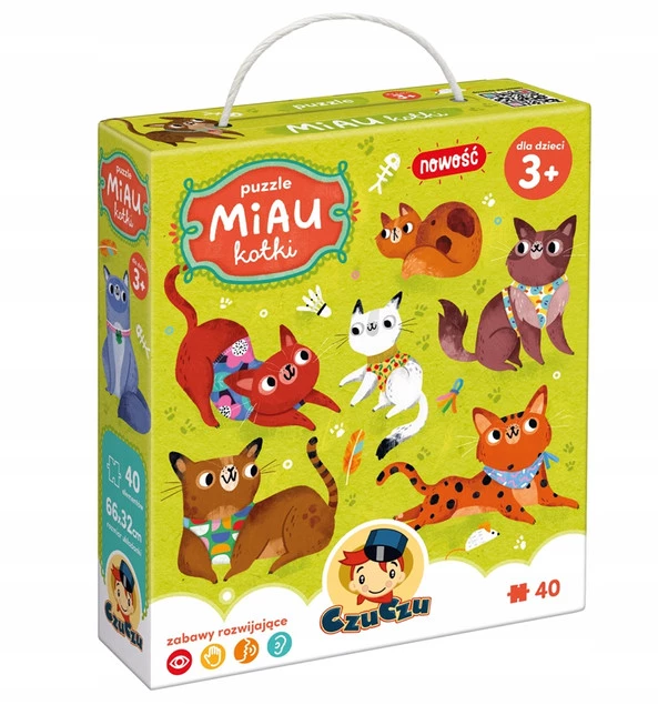 Puzzle Miau Kotki składają się z 40 elementów i świetnie sprawdzą się jako kolejne puzzlowe wyzwanie dla trzylatków i starszaków. Zabawa dla przedszkolaków jest naturalnym polem do eksperymentowania i odkrywania świata, a urocze koty i kociaki inspirują do wielu rozwijających aktywności.
