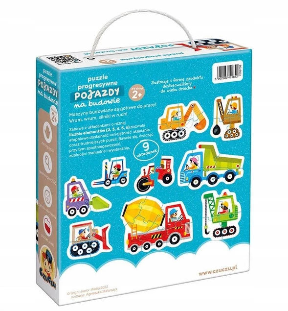Poręczne pudełko stało się garażem dla 9 wspaniałych maszyn z placu budowy. 9 układanek ma różną liczbę elementów: 2, 3, 4, 5 i 6. Dzięki nim dzieci mogą doskonalić sztukę układania coraz trudniejszych puzzli krok po kroku. Kolorowe rewersy pomogą w rozdzieleniu elementów. Piękne ilustracje, duże puzzle i ich forma sprawiają, że zestaw doskonale sprawdzi się jako pierwsze wieloelementowe układanki dla początkujących układaczy.