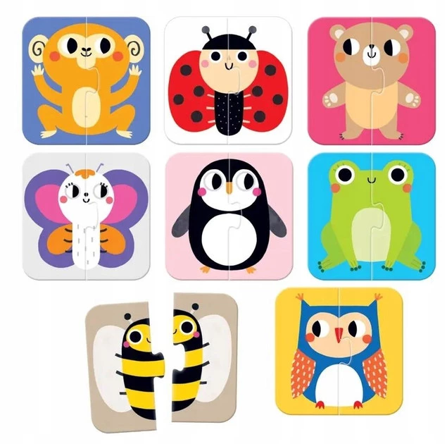 Co to za zwierzątka? Połączcie połówki i przekonajcie się sami! Dwuelementowe układanki doskonale sprawdzą się jako pierwsze puzzle dla maluszków.