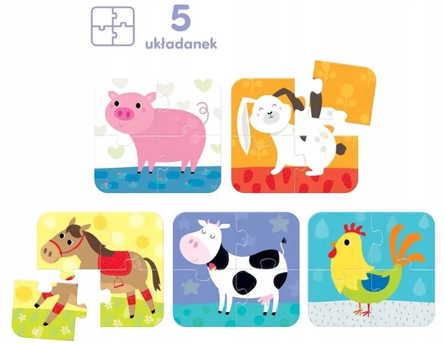 Każdy obrazek składa się z 4 puzzli, dlatego edukacyjny zestaw znakomicie sprawdzi się u maluchów, które początek układania mają już za sobą. Pełne humoru, barwne ilustracje zachęcają dzieci do łączenia elementów i twórczej zabawy. Zobaczcie, że możecie tworzyć także nieoczywiste połączenia. Formę, tematykę i ilustracje układanek dostosowaliśmy do wieku początkujących układaczy. Pojedźmy razem na wieś!