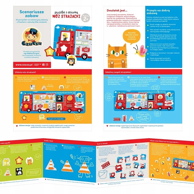 Kolorowa, wielka panoramiczna układanka przedstawia w pełni wyposażony wóz strażacki i jego dzielną załogę. Oprócz tradycyjnych puzzli ma także wyjmowane elementy, które należy dopasować do odpowiednich dziurek o różnych kształtach. Znakomicie sprawdzi się jako pierwsze wieloelementowe puzzle dla maluchów, nie tylko wielbicieli straży pożarnej. W edukacyjnym zestawie znajdziecie poradnik pełen pomysłów na różnorodne, rozwijające zabawy.