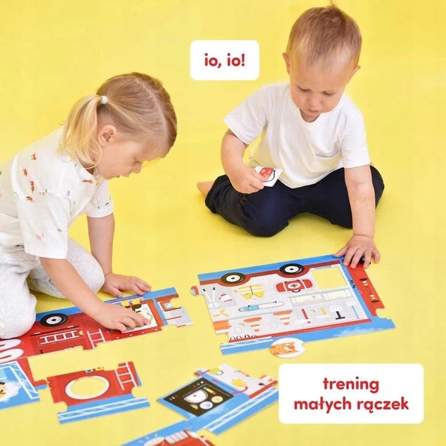 Io, io! Czas na puzzlową przygodę i zabawę w poznawanie kształtów. Wskakujcie do wozu strażackiego, ruszamy do akcji!