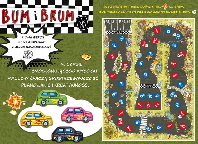 Maluchy biorą udział w emocjonującym rajdzie pełnym przykrych i miłych niespodzianek. Wybierz swojego malucha, ułóż trasę wyścigu i… pędź prosto do mety! Ptasia kupa (BUM) czy nitro (BRUM)? Nigdy nie wiadomo, co spotkasz na drodze do zwycięstwa. Jedno jest pewne: musisz być pierwszy na mecie!