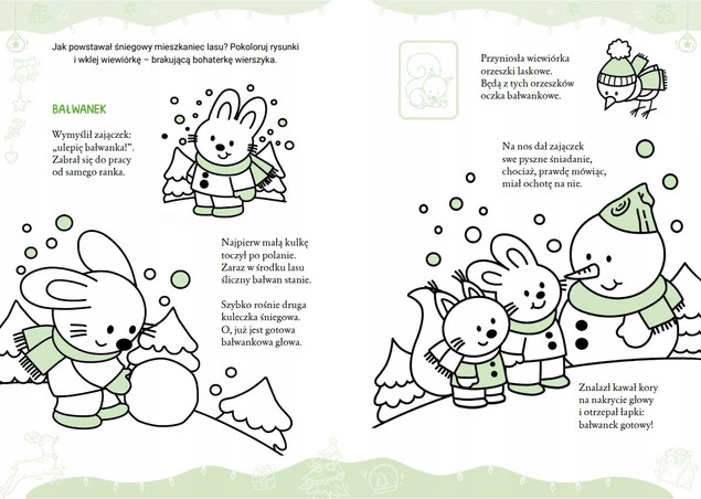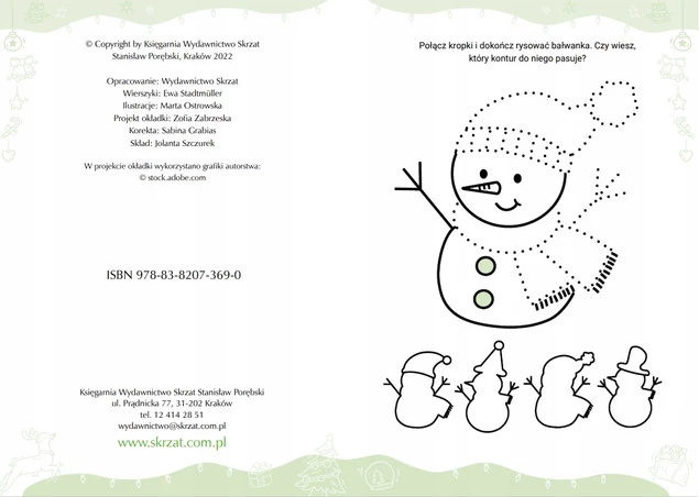 Śnieżne kolorowanki, zgadywanki, ozdabianki i rysowanki. Nastrojowe wierszyki znanej krakowskiej poetki Ewy Stadtmüller. Naklejki dodające uciech.