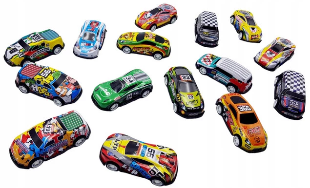 W zestawie znajdują się samochodziki w różnych kolorach i wzorach.