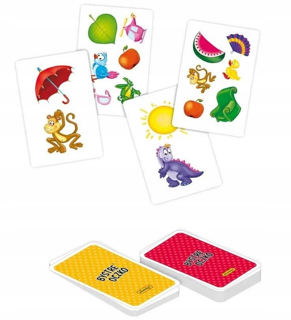 Zestaw zawiera 48 kart o wym. 11 cm x 7,4 cm oraz instrukcje z opisem pięciu wesołych gier rodzinnych. Gry zawierają elementy edukacyjne. Podczas zabawy gracze ćwiczą spostrzegawczość, pamięć i refleks.