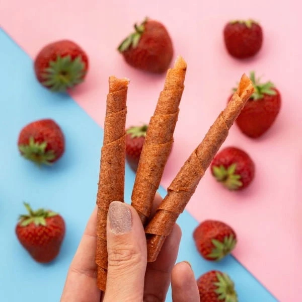 Witaminowe rollsy™ wykonane są z puree jabłkowo-truskawkowego suszonego w niskiej temperaturze.