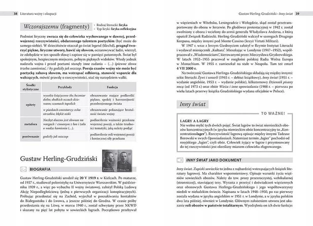 ✔Obejmuje wszystkie lektury obowiązujące z zakresu podstawowego, które będą wymagane na sprawdzianach oraz na maturze z języka polskiego. Każda z lektur została dokładnie omówiona, zawiera streszczenia i problematykę, spis bohaterów, a całość uzupełniają notki biograficzne autorów. Ponadto zamieszczono w niej analizy i interpretacje wymaganych na języku polskim wierszy oraz omówiono cechy charakterystyczne każdej epoki literackiej. W części czwartej omówiono epoki: Literatura wojny i okupacji oraz Literatura współczesna.