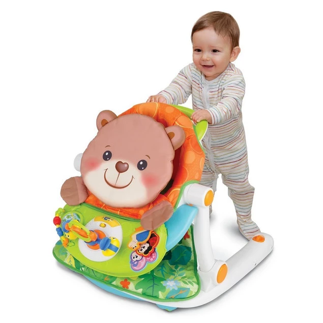 Zabawka jest bardzo praktyczna, posiada kilka funkcji i rośnie wraz z dzieckiem. W zależności od Waszych wspólnych potrzeb może stanowić miękki fotel do karmienia lub zabawy. Może zostać także przekształcona w jeździk-pchacz, który idealnie sprawdza się podczas stawiania pierwszych kroczków. Regulacja prędkości kółek czyni z Wygodnego Misia bezpieczną zabawkę do nauki chodzenia. Niezależnie od tego, czy model służy najmłodszym pociechom jako fotel, czy pchacz, jego budowa i solidne oparcie gwarantują dziecku bezpieczną pozycję – zarówno siedzącą, jak i stojącą. Odłączany panel aktywizujący z zabawkami sprawia, że Wygodny Miś stymuluje także rozwój zmysłów i ćwiczy sprawność małych rączek. Wszystko za sprawą przesuwanych koralików, bezpiecznego lusterka, bajkowych zwierzaków i ruchomych elementów, które grają melodie i emitują efekty świetlne.