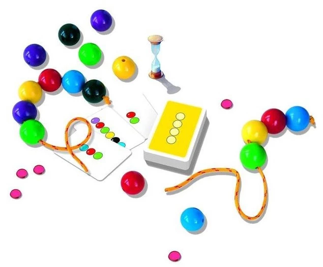 kolejność kolorów. Po sygnale nawlekaj na linkę jak najszybciej kolorowe kule – zgodnie z układem odczytanym z karty. Wspaniałą zabawa, która jest jednocześnie