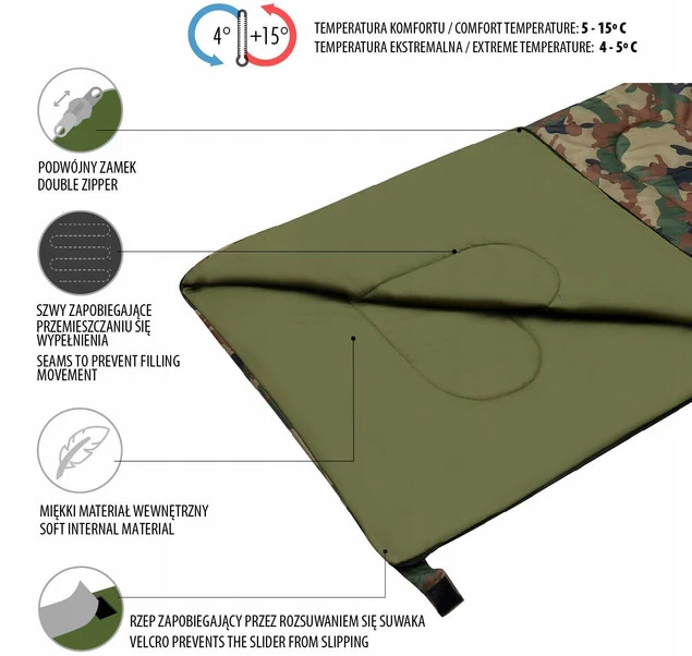 Charakteryzuje się bardzo dobrą jakością wykonania i najlepszymi materiałami. Zarówno wypełnienie, jak i materiał zewnętrzny to wytrzymałe, nowoczesne tkaniny poliestrowe. Dodatkowo pokryte są powłoką nie przepuszczającą zimna i wilgoci. Skutkuje to spokojnym, ciepłym snem nawet przy niskich temperaturach. Dla jeszcze większego komfortu użytkowania śpiwór posiada specjalne przeszycia zapobiegające przemieszczaniu się wypełnienia. Jest zapinany na zamek błyskawiczny, a rzep umieszczony na jego końcu zabezpiecza przed rozsuwaniem się podczas snu. Śpiwór rozpina się zarówno z boku jak i z dołu dzięki czemu można użytkować go również jako kołdrę. Model wyróżnia się również tym, że posiada możliwość łączenia ze sobą dwóch śpiworów.