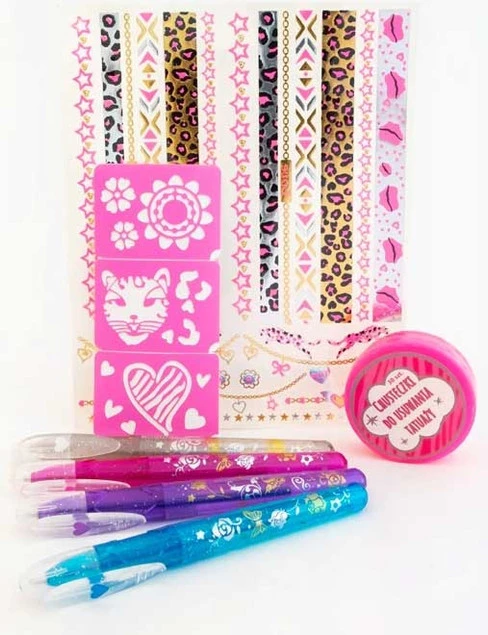 - Akcesoria w zestawie: 4 brokatowe markery do tatuażu,, 3 szablony,, 1 arkusz metalicznych tatuaży,, 30 chusteczek do usuwania tatuaży.