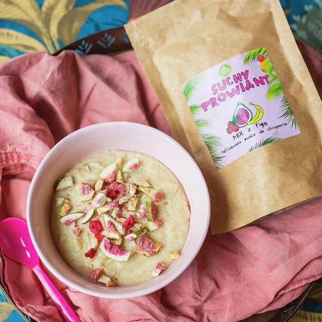 Suchy Prowiant MIX z FIGĄ to mieszanka liofilizowanych owoców, w wygodnej zamykanej saszetce. Chrupiące i aromatyczne owoce to najlepszy wybór, gdy chcemy sięgnąć po zdrową i pyszną przekąskę poza sezonem na świeże owoce. Różnorodność owoców w mieszance sprawia, że jest ona bajecznie kolorowa i zaskakuje odmiennością smaków każdego ze składników. Słodka figa oraz banan w towarzystwie kwaśnej żurawiny - to jest naprawdę dobre połączenie!
