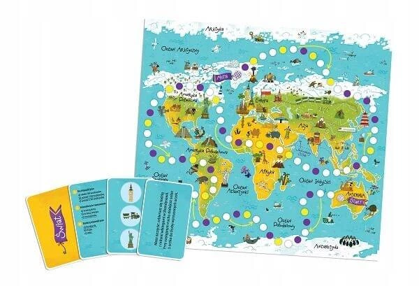 Gra edukacyjna Świat to nie lada gratka dla najmłodszych miłośników podróży. Rozpocznijcie rodzinną przygodę, podczas której odwiedzicie najciekawsze miejsca na Ziemi, poznacie skarby natury i architektoniczne perełki. Każda rozgrywka to porcja informacji o świecie, które pomogą rozwiązać przygotowane zagadki. Ta wiedza zaprocentuje nie tylko w życiu codziennym, ale również na lekcjach przyrody i geografii.